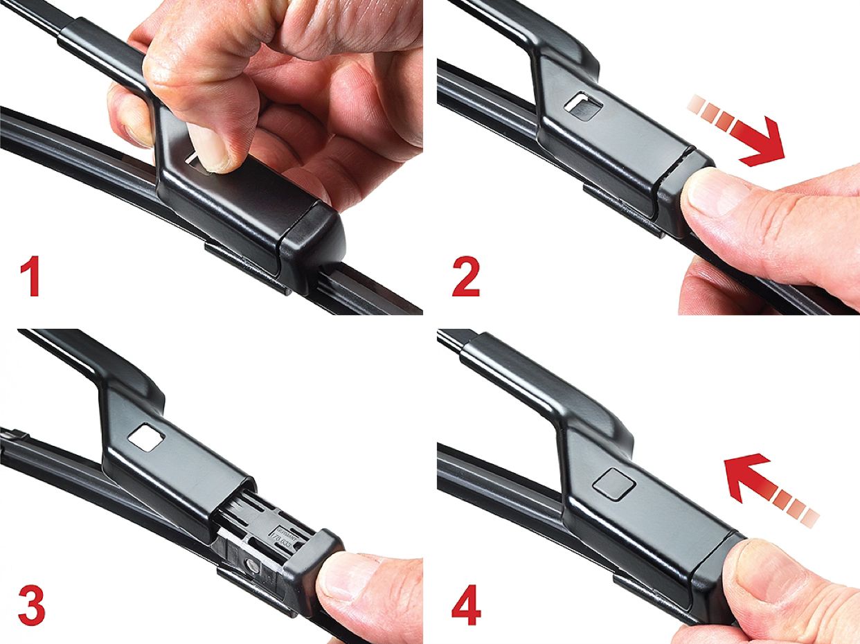 1:دکمه نگهدارنده تیغه برف پاککن قدیمی را به سمت پایین فشار دهید